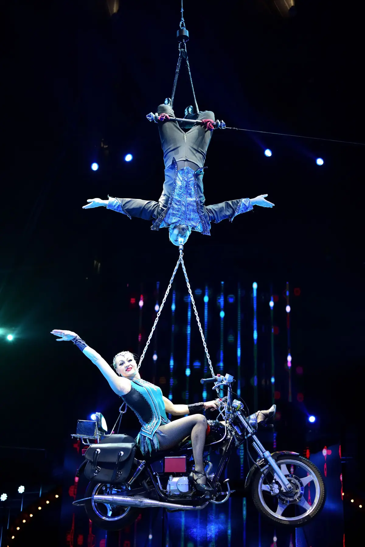 Leo « Jaws » et « Iron Lady » Vita fascinent le public avec leurs impressionnantes acrobaties à la perche. Dans un numéro spectaculaire dans les airs, Jaws tient Iron Lady uniquement avec ses dents.