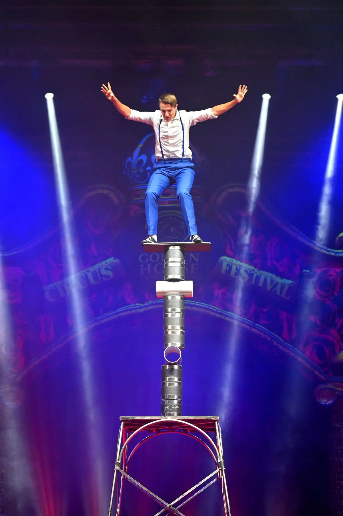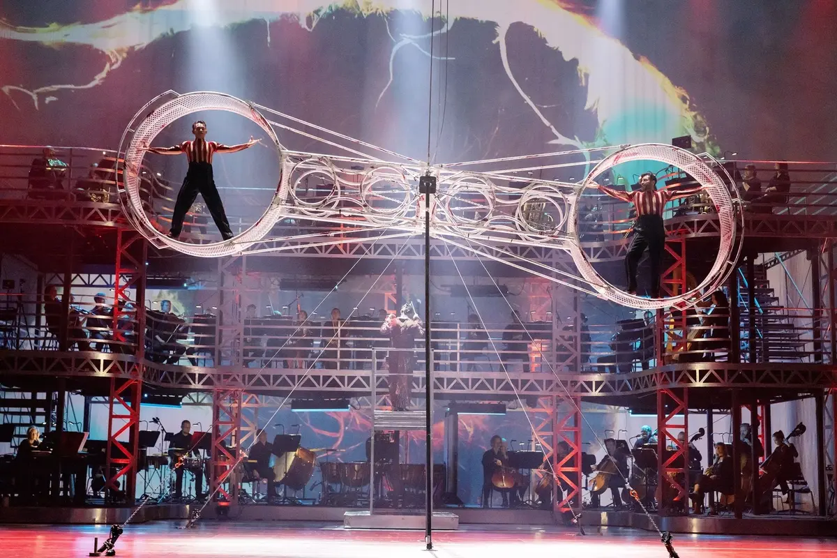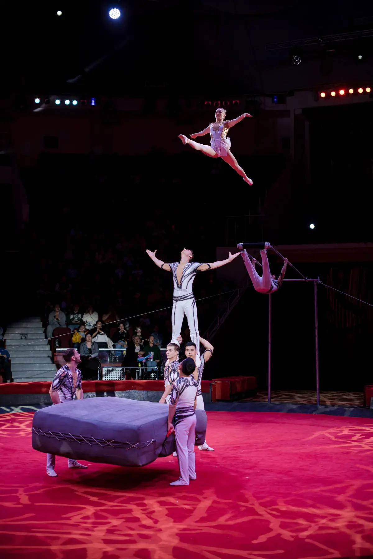 The Legion, originaire du Kazakhstan, présente un spectacle plein de dynamisme, d'élégance et d'acrobaties spectaculaires sur la balançoire russe. Les acrobates et l'acrobate virevoltent dans le manège dans une apparente apesanteur et captivent le public depuis les hauteurs.