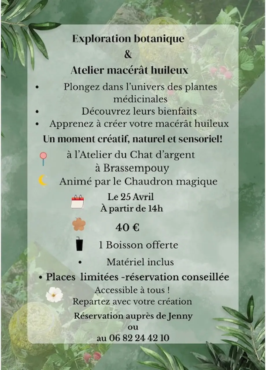 Plongez dans l'univers des plantes médicinales et découvrez leurs bienfaits. Apprenez à créer votre macérat huileux. Un moment créatif, naturel et sensoriel, animé par le chaudron magique. Repartez avec votre création.