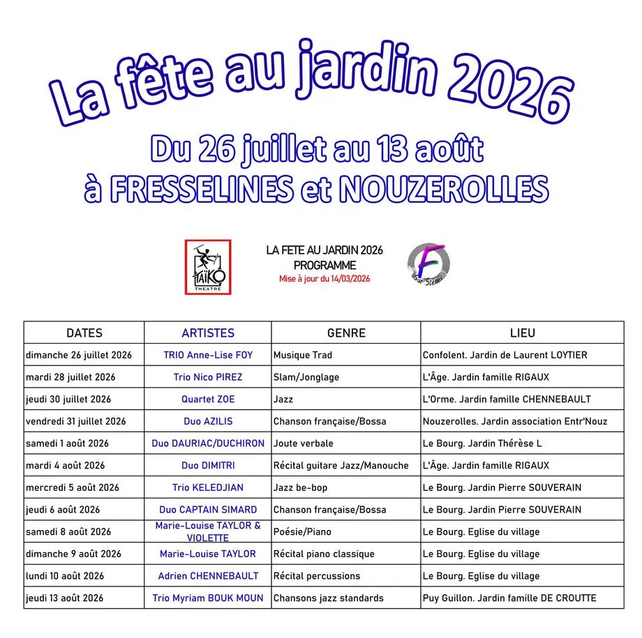 La fête au jardin à Fresselines propose différents spectacles du 26 juillet au 13 août : musique, concerts, théâtre, lecture, danse…