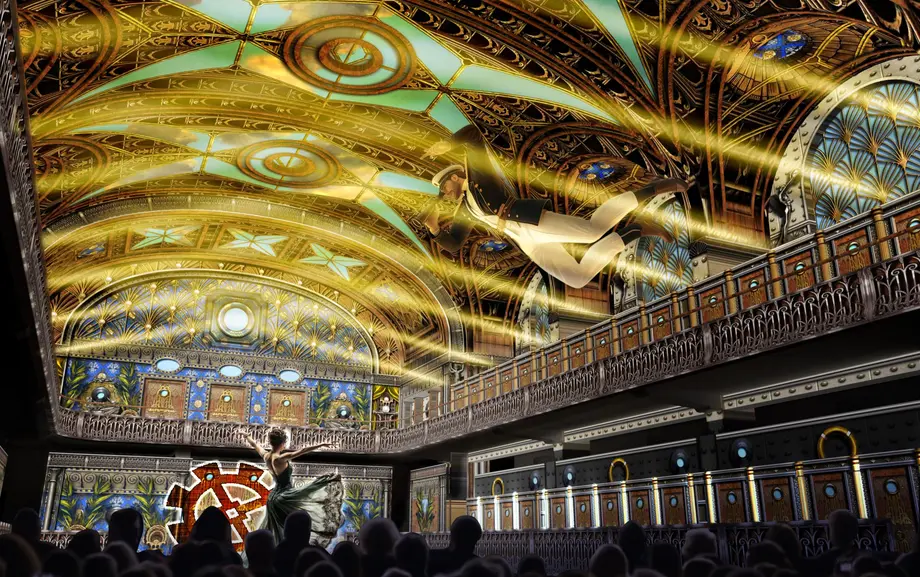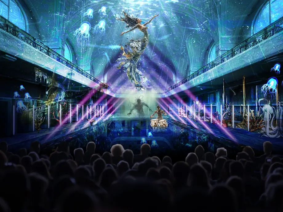Toute l'architecture Art Déco du lieu sera habillée de projections, de trompe-l'œil et d'illusions d'optique redessinant des décors en perpétuelle mouvance. Les spectateurs seront installés confortablement sur un îlot dressé au sein même de l'ancien bassin, ou en hauteur sur les balcons du monument.