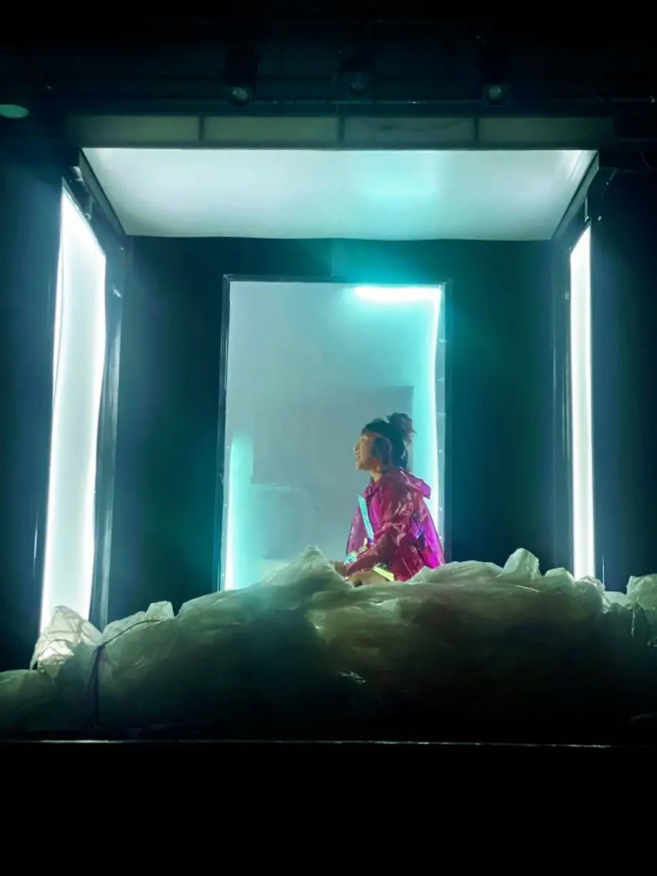 Dans son abribus, décor urbain fait de lumières LED, de plexiglas et de métal, accompagnée par un travail sonore aiguisé, elle nous ouvre son monde intérieur, contrasté de poésie et de violence imagée, souvent sur le fil, mais jamais angoissant, et nous embarque avec elle dans des séquences parallèles, nous donnant l’envie de ressortir vivants, plus que jamais soi-même !