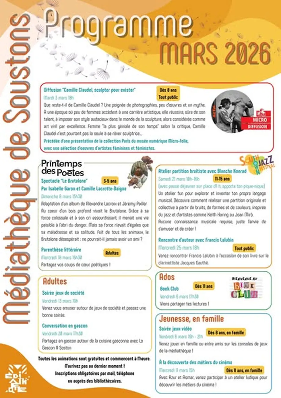 Ateliers Sciences et Arts pour les jeunesLe 11/03/2026SoustonsLes enfants sont divisés en petits groupes de 4 ou 5 qui passent successivement aux différentes activités proposées, à intervalles d’environ trente […]