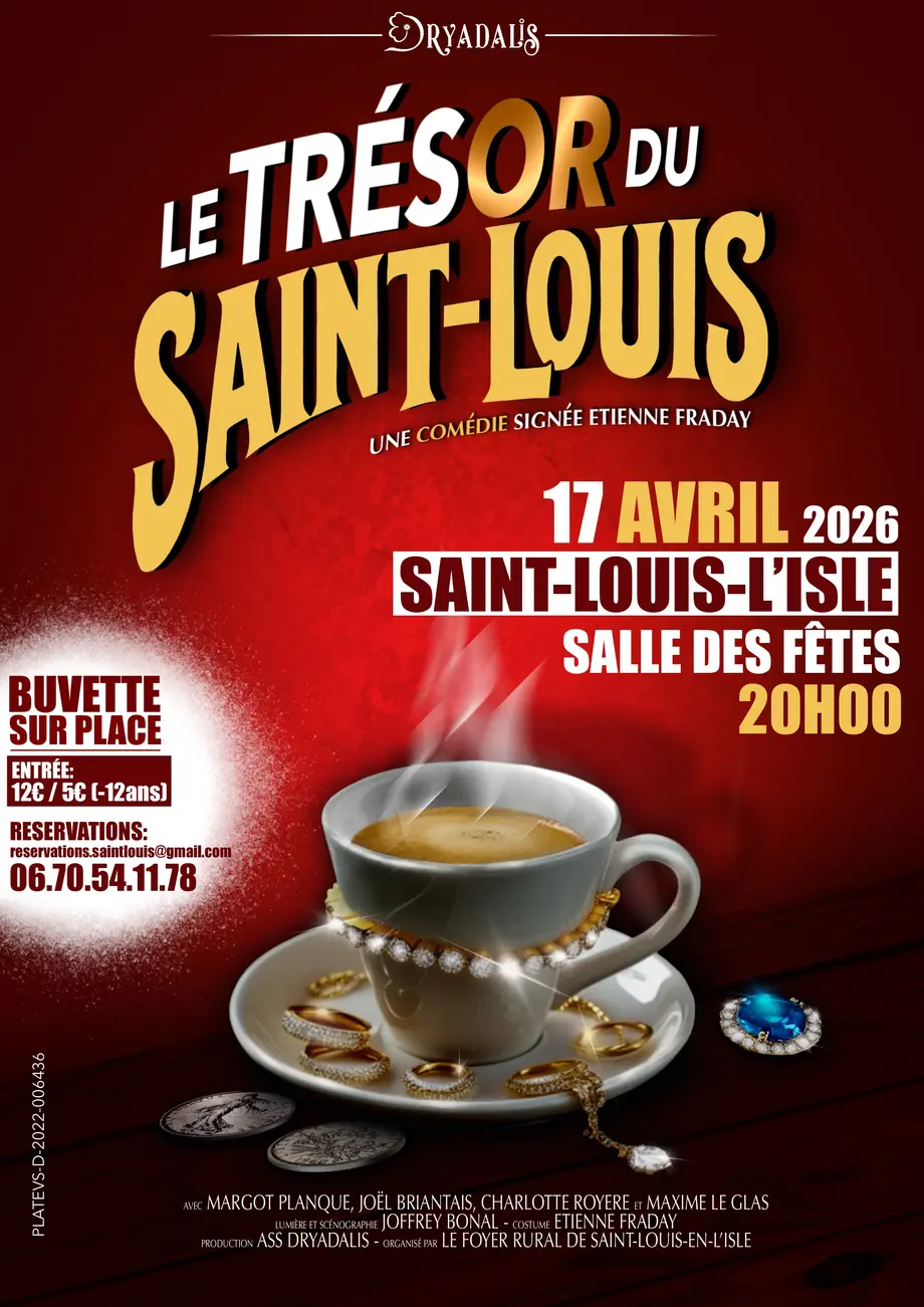 Théâtre | Le trésor du Saint-LouisLe 21/04/2026Villefranche-de-LonchatLa Compagnie Dryadalis revient, après Le Facteur et Tapis Jaune, avec sa nouvelle comédie : Le Trésor du Saint-Louis.