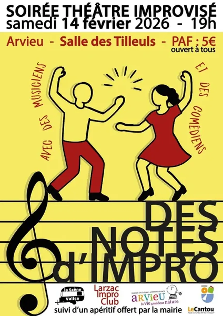 Soirée de théâtre d'impro « Des notes d'impro » par le Larzac Impro Club. Venez profiter de toute l'énergie de ces comédiens et musiciens ! Tout public.