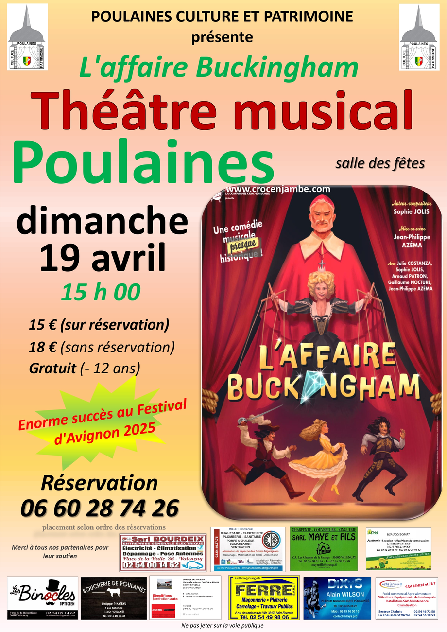 L’association Poulaines Culture et Patrimoine présente un spectacle de théâtre musical à 15 h à la salle des fêtes : L’affaire Buckingham.