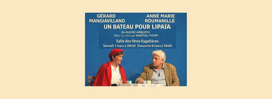 Rendez-vous à la Salle des Fêtes pour profiter de la représentation théâtrale « Un Bateau pour Lipaïa » d’après l’œuvre d’Alexeï Arbuzov. Mise en scène par Martial Thury, avec Anne-Marie Roumanille et Gérard Mangiavillano.