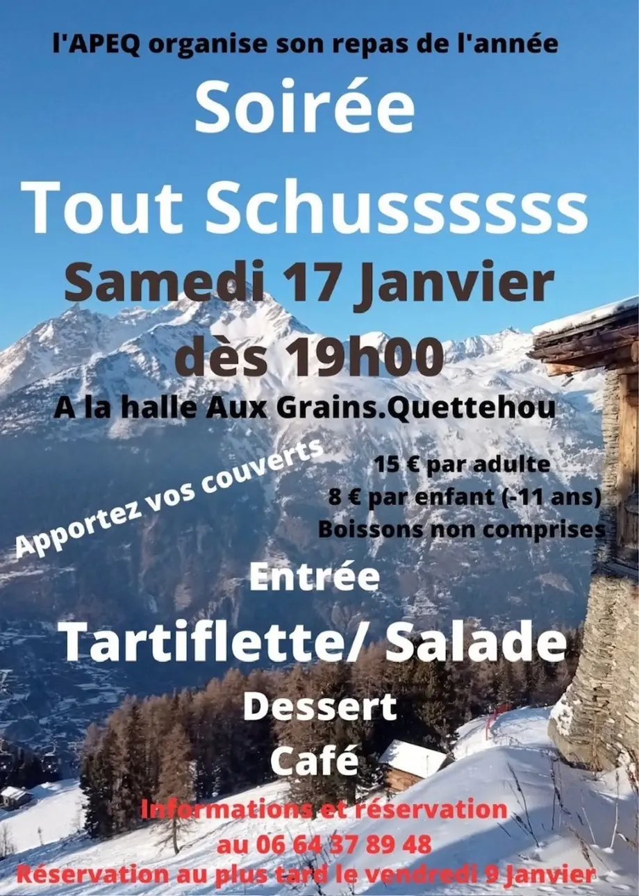 Repas Tartiflette à partir de 19h (15 euros/adulte ; 8 euros/enfant - 11 ans) Boissons non comprises, pensez à apporter vos couverts.