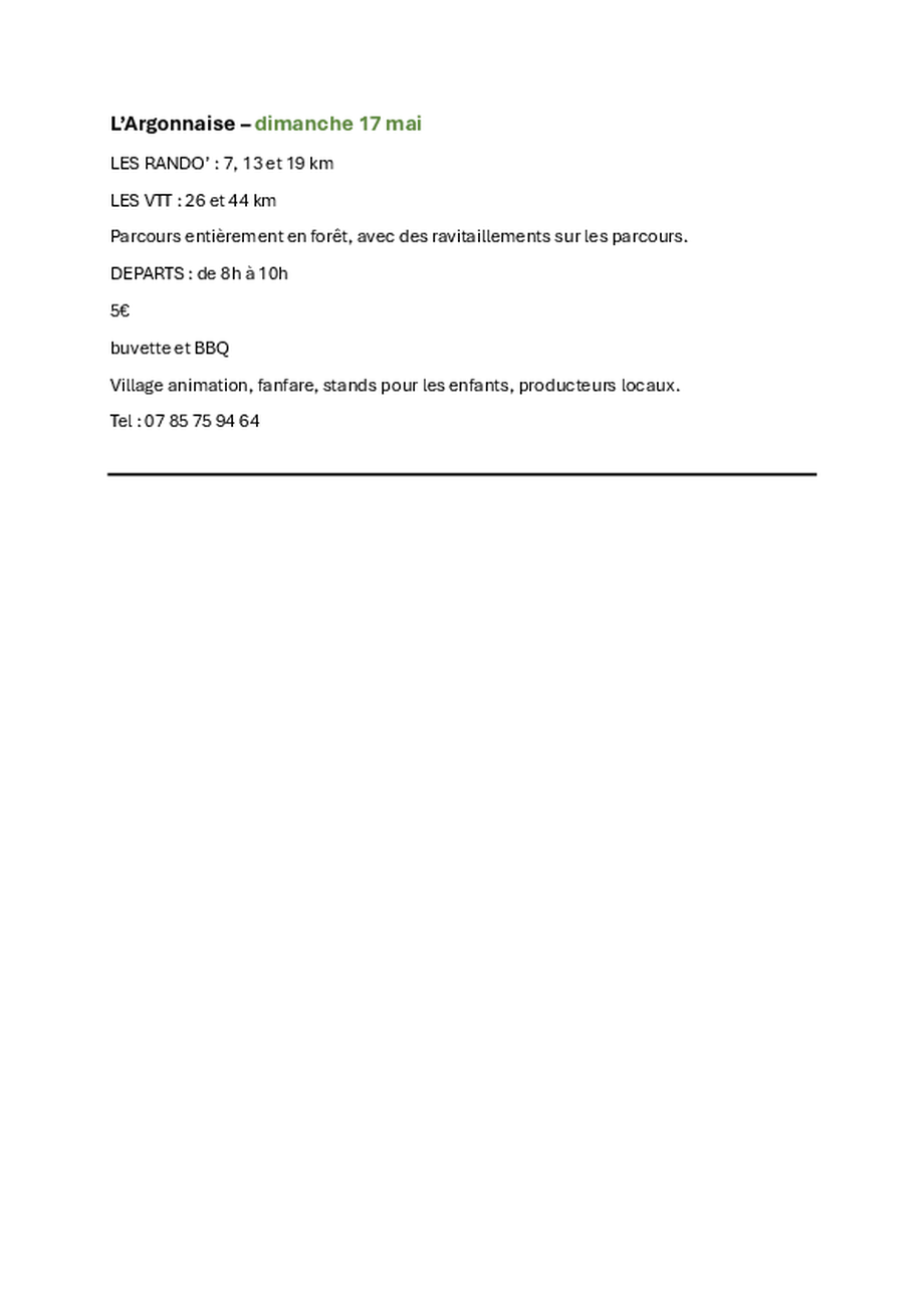 - L’Argonnaise, avec plusieurs boucles pédestres et VTT, le 17 mai à Beaulieu-en-Argonne.