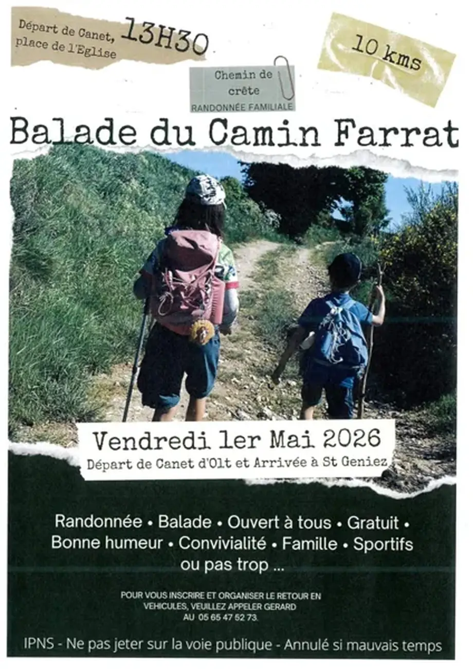 Au départ de la place de l’Église de Canet-d’Olt à 13 h 30, cette randonnée familiale de 10 km descend jusqu’à Saint-Geniez-d’Olt-et-d’Aubrac. Que vous soyez sportif (ou pas trop), solo, en famille ou entre amis, chaussez vos chaussures de rando ou vos baskets et venez découvrir (ou redécouvrir) les jolis paysages alentour !