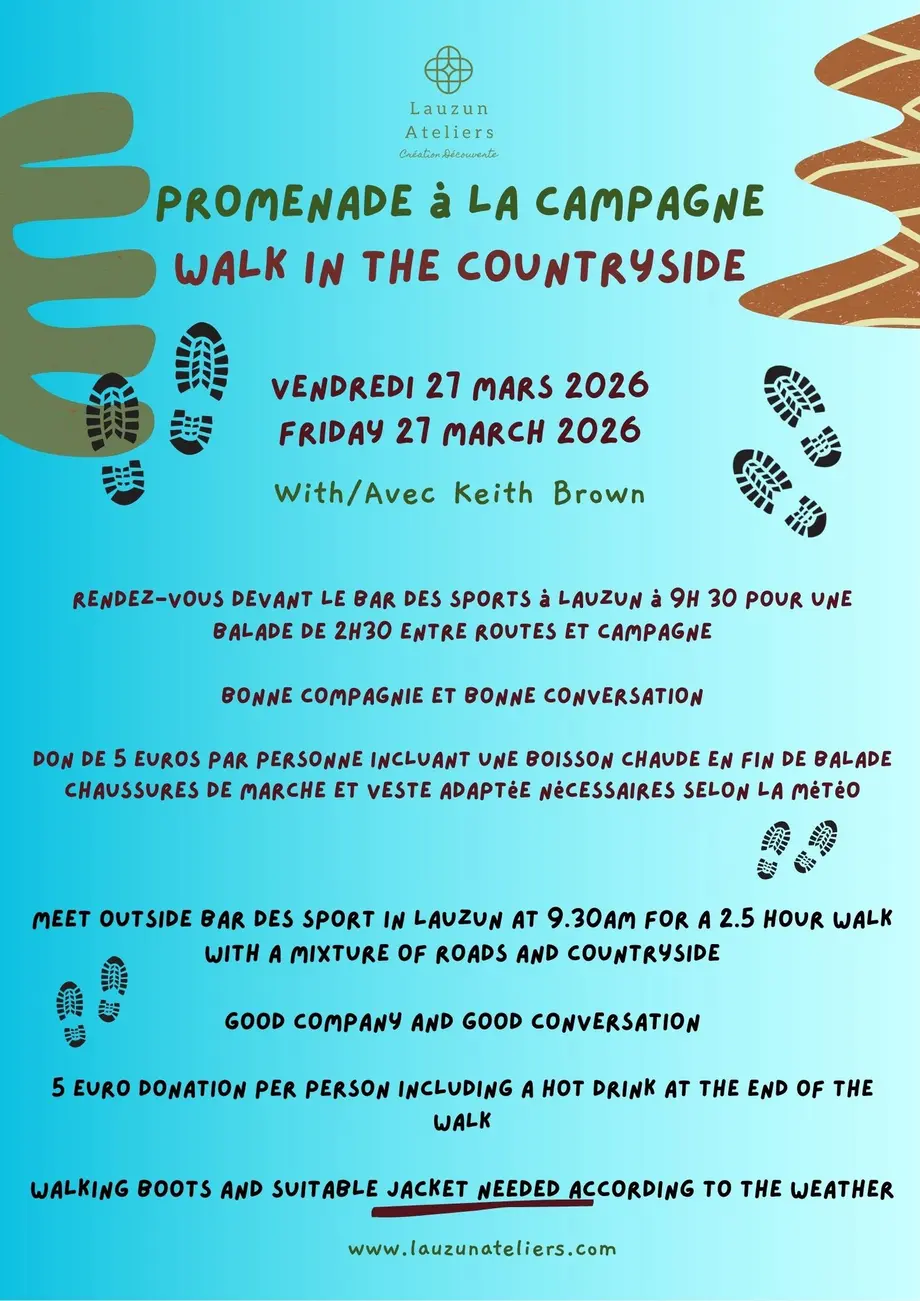 Venez nombreux rejoindre Keith Brown pour une balade autour de Lauzun et de ses environs, organisée par l'association Lauzun : Ateliers, Création et Découverte.