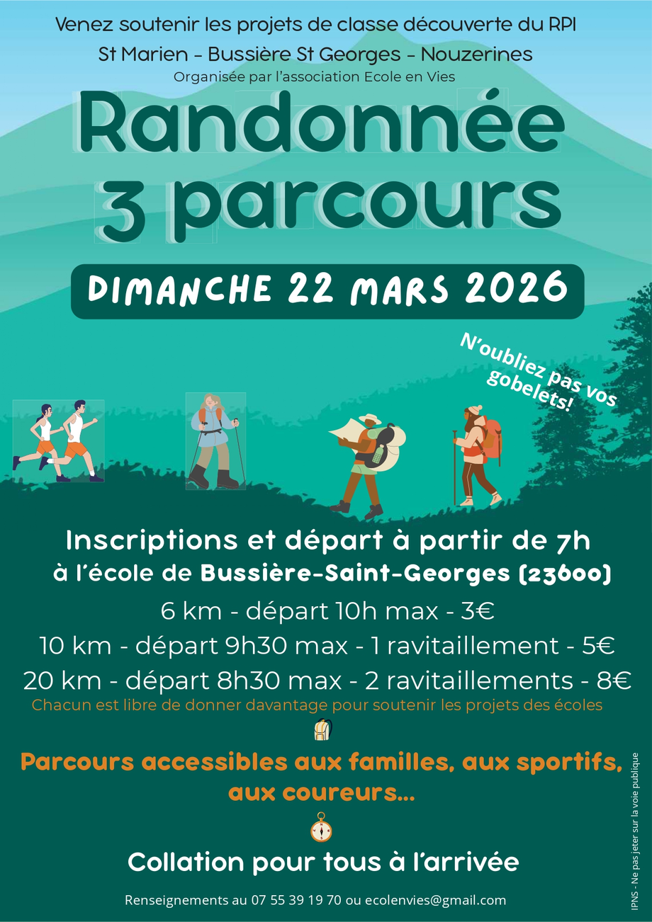 Rando promenadeLe 07/03/2026Dun-le-PalestelRando-promenade à Dun-le-Palestel : rendez-vous à la salle des loisirs à 13 h 30 pour une marche de 6 km.