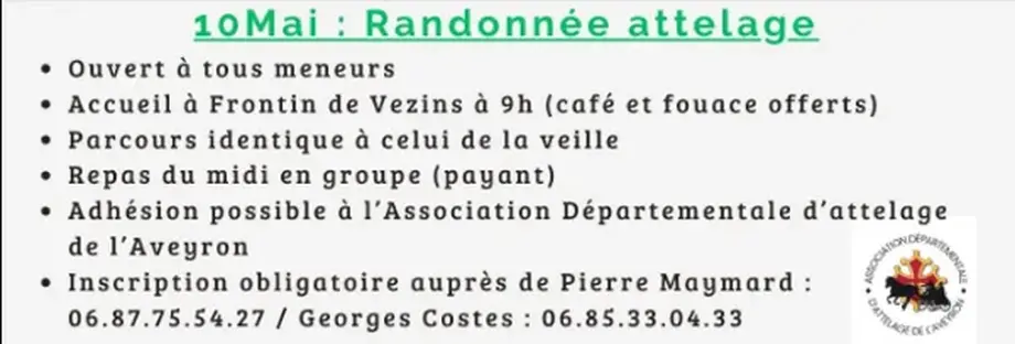 Randonnée à ChevalLe 09/05/2026Vézins-de-Lévézou9 h – Frontin