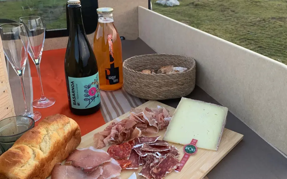 Dégustation gourmande face aux panoramas d’Iraty, avec du fromage de la ferme, de la charcuterie basque, du gâteau basque et une boisson locale, pour un moment de partage et d’immersion dans le terroir et la culture pastorale.