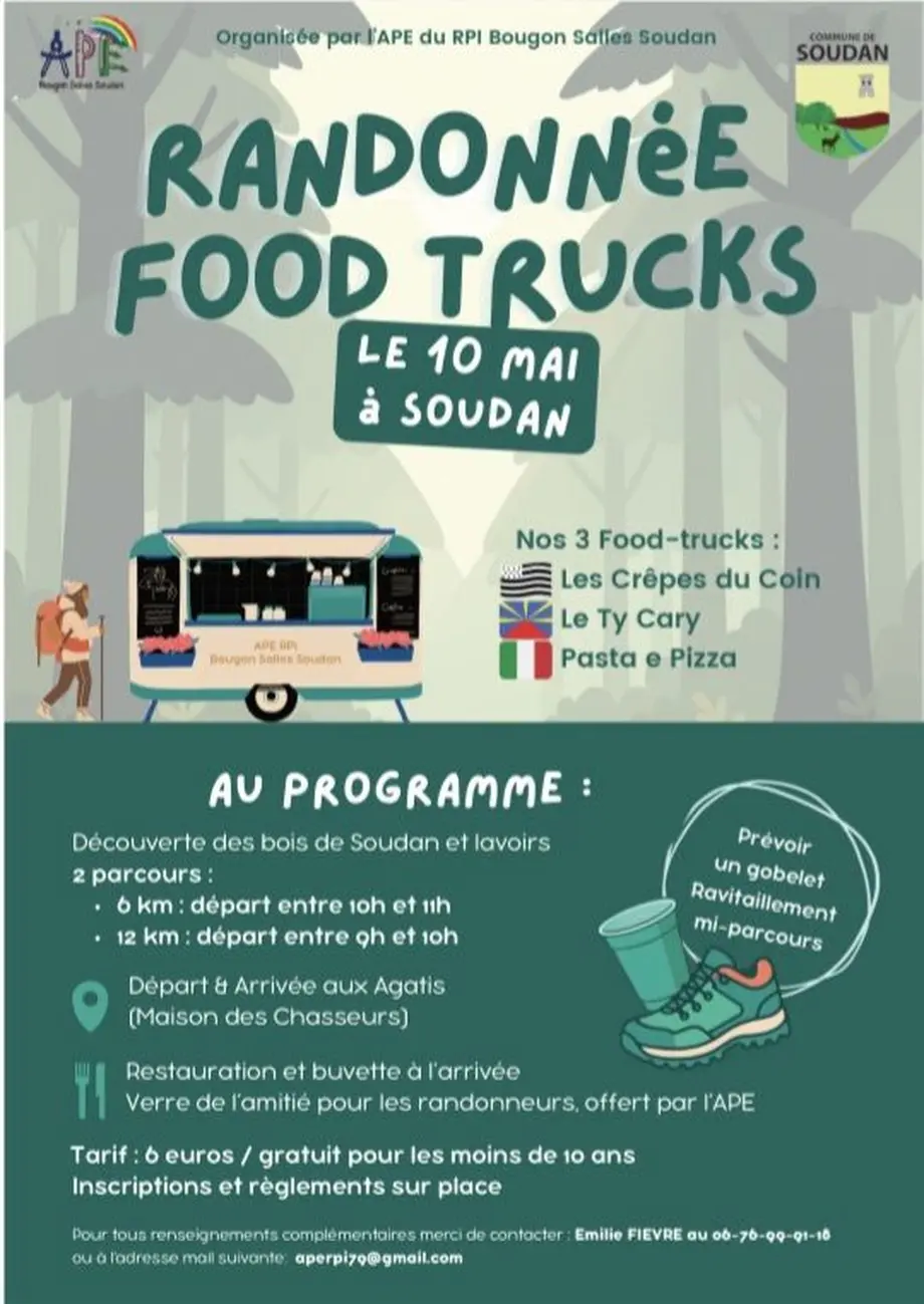 Nous vous attendons nombreux le dimanche 10 mai pour la randonnée organisée par l'APE du RPI Bougon, Salles et Soudan, puis, si le cœur vous en dit, partager un repas après la randonnée.