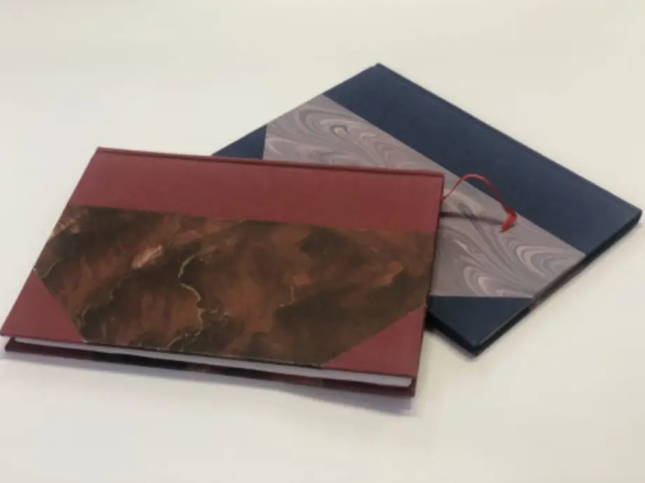 - Réalisation de la couverture en toile et papier marbré à la cuve, issu du fonds de Maurice.