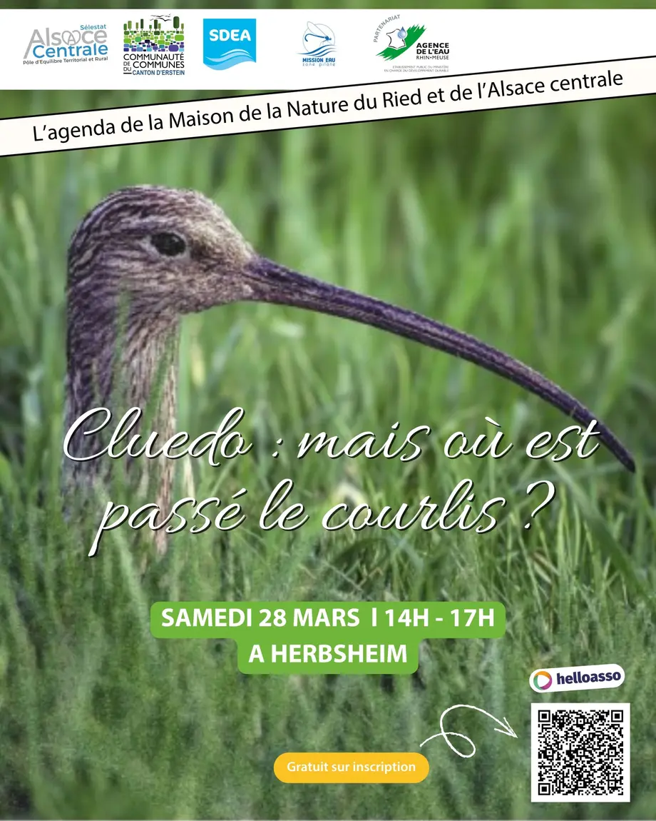 Le courlis vient nicher dans nos prairies à l’arrivée du printemps, descendant du grand Nord avant de repartir. Mais dans notre Grand Ried nous ne trouvons plus le courlis, il a disparu, victime d’un acte malveillant ? Partez à la recherche du courlis, recherchez le coupable de sa disparition, à la manière d’un cluedo géant.