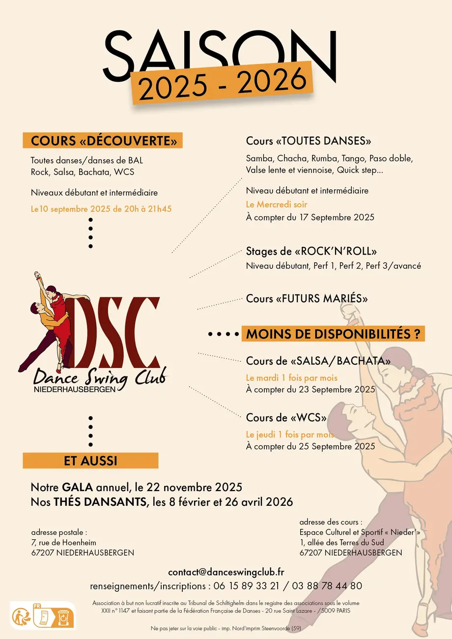 - le mercredi 10 septembre 2025 à 20 heures : 1 SOIREE DECOUVERTE des danses de bal, danses standards, latines, salsa, bachata, rock, wcs.