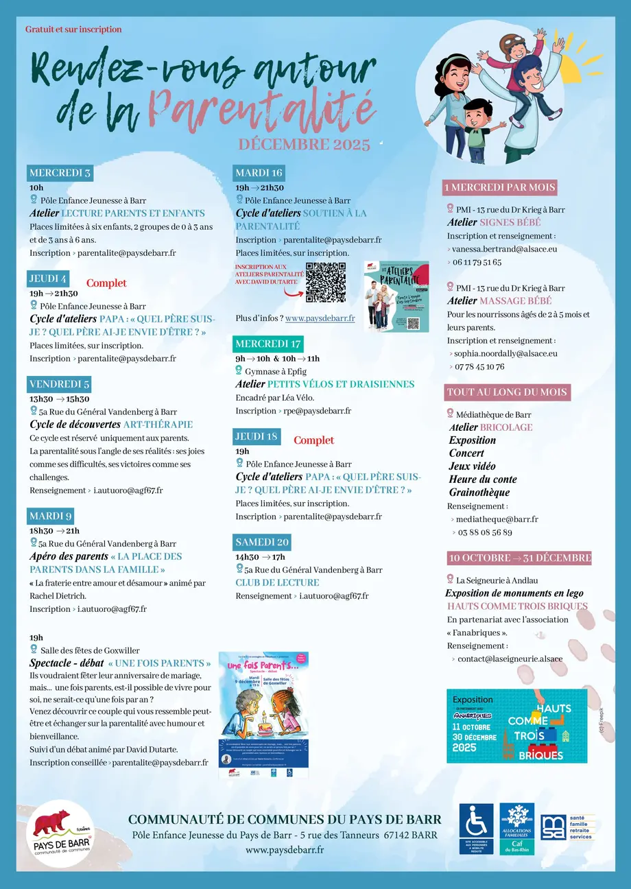 Le territoire du Pays de Barr est heureux de vous dévoiler son programme du mois de décembre : « Les rendez-vous autour de la parentalité », un ensemble d'événements pensés pour accompagner et soutenir les parents au quotidien.