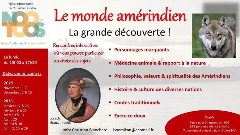 Participez à la découverte des premières nations des Amériques. Leur histoire, leur culture, leurs grands personnages, leur approche de la santé et de la spiritualité. Ecoutons leurs riches enseignements par l’entremise de contes traditionnels, de documents audiovisuels et de cartes médecines. Nous en profiterons aussi pour mettre le corps en mouvement.