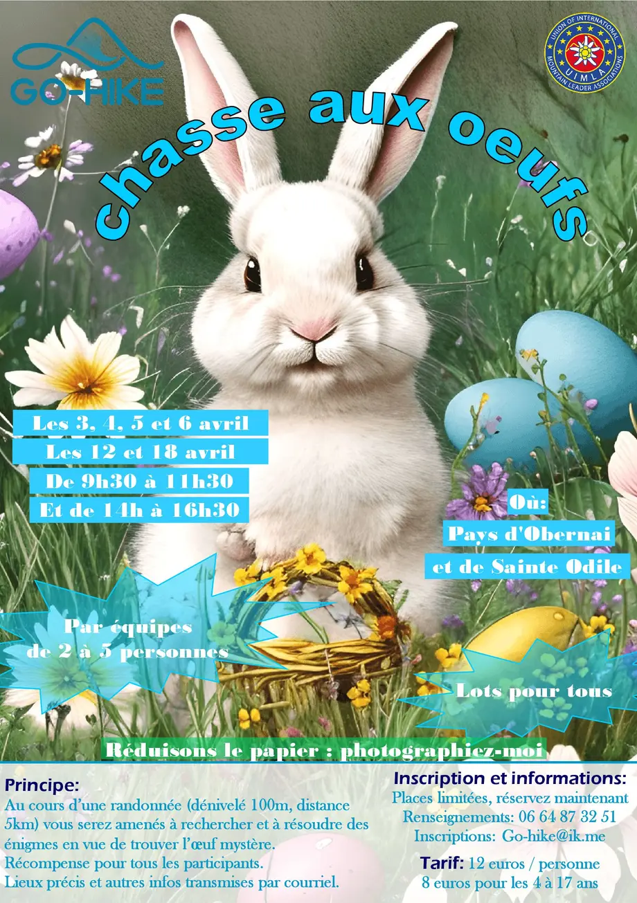 Plongez au cœur de la nature luxuriante du Mont Sainte-Odile lors de notre chasse au trésor de Pâques féerique ! Laissez-vous envoûter par la beauté des paysages environnants alors que vous serez chargés de sauver le lapin de Pâques caché dans un recoin secret du site. Suivez les indices parsemés sur votre chemin et laissez-vous guider par l'esprit de Pâques. En famille ou entre amis, vivez un moment de complicité et de joie en découvrant les trésors dissimulés dans ce cadre enchanteur. Une aventure inoubliable vous attend au Mont Sainte-Odile, où la magie de Pâques opère à chaque pas.