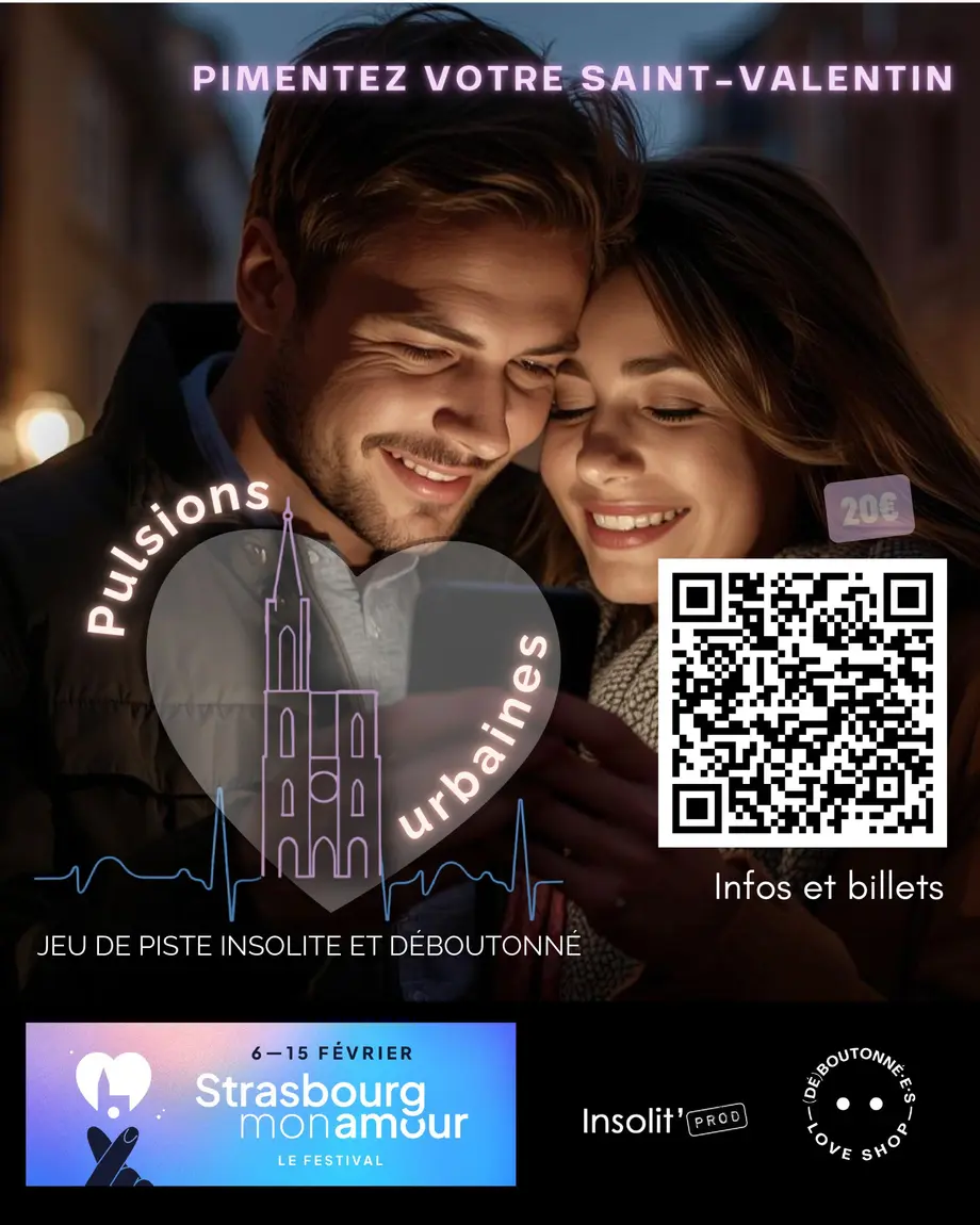 Pulsions Urbaines est un jeu de piste digital outdoor résolument sexy, à vivre à deux (ou plus) dans le centre de Strasbourg. Jouable sur smartphone, il s’adresse aux couples, dates ou complices avides de jeux, de désir et de connexion.