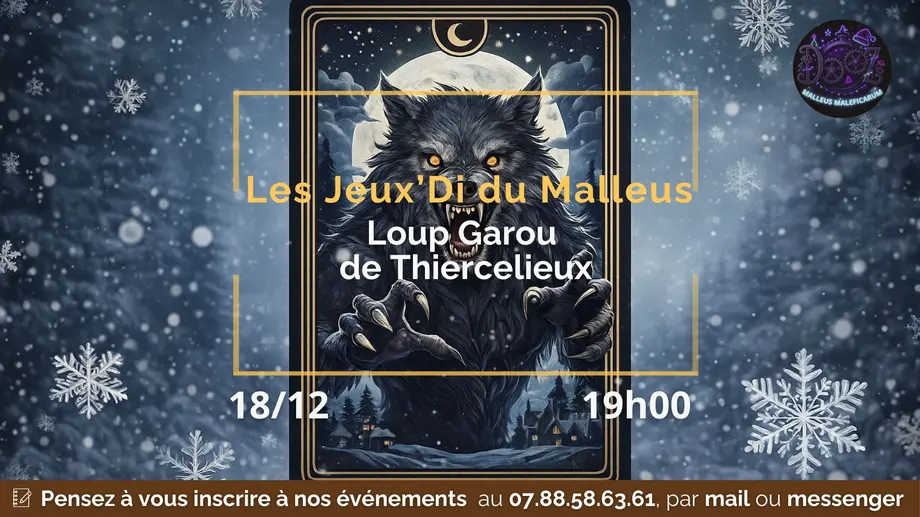 Le Malleus Maleficarum propose une soirée dédiée au jeu Loup-Garou de Thiercelieux, sur le thème de Noël. Les participantes et participants incarnent des villageois, des loups-garous ou des rôles spéciaux, et traversent des phases de jour et de nuit rythmées par les discussions, les votes et les révélations de cartes.