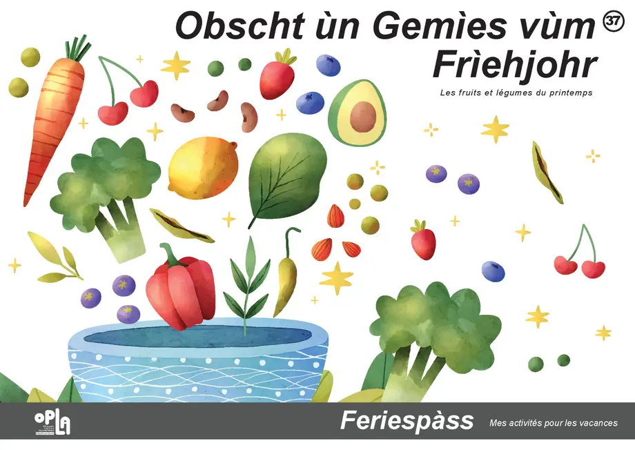 L'Office public de la langue régionale d'Alsace (OPLA) propose le Feriespàss, un cahier d'activités destiné aux enfants pour découvrir l'alsacien de façon ludique pendant les vacances scolaires. Le dernier numéro, consacré aux fruits et légumes du printemps, est disponible en version bas-rhinoise et haut-rhinoise sur la plateforme Lehre.