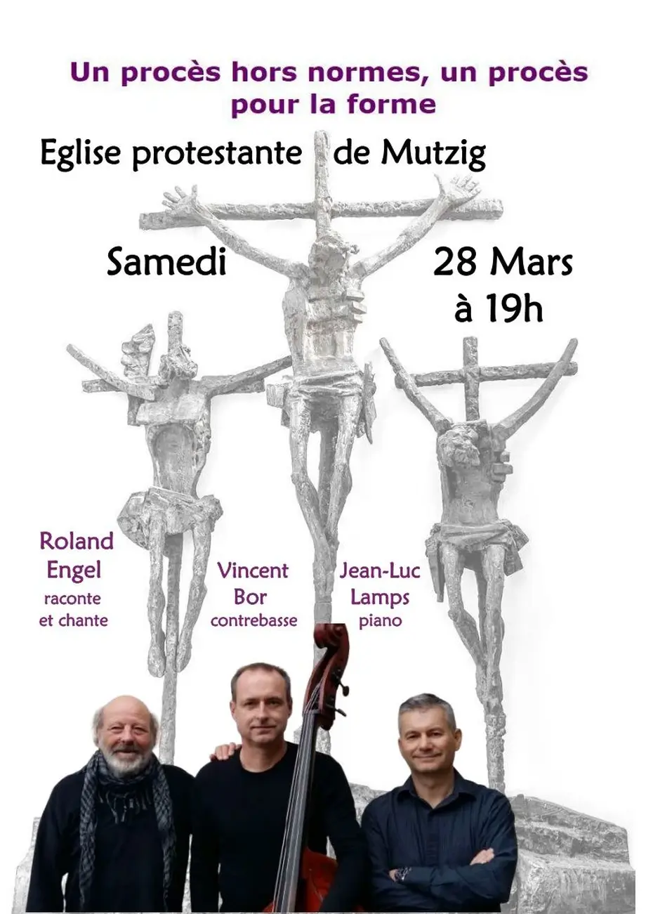 Roland Engel raconte et chante, accompagné au piano par Jean-Luc Lamps et à la contrebasse par Vincent Bor.