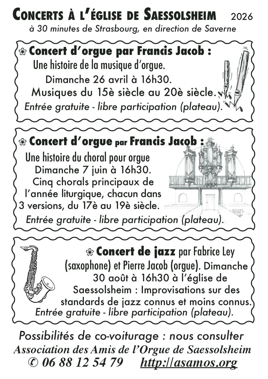 Pour les concerts à Saessolsheim, l’association des amis de l’orgue incite au co-voiturage, comme passager ou conducteur. Elle invite les intéressés à la contacter afin de mettre les personnes en contact. Co-voiturer c’est : faire des économies, une bonne démarche par rapport à l’environnement, simplifier le parking, peut-être faire des rencontres sympathiques…