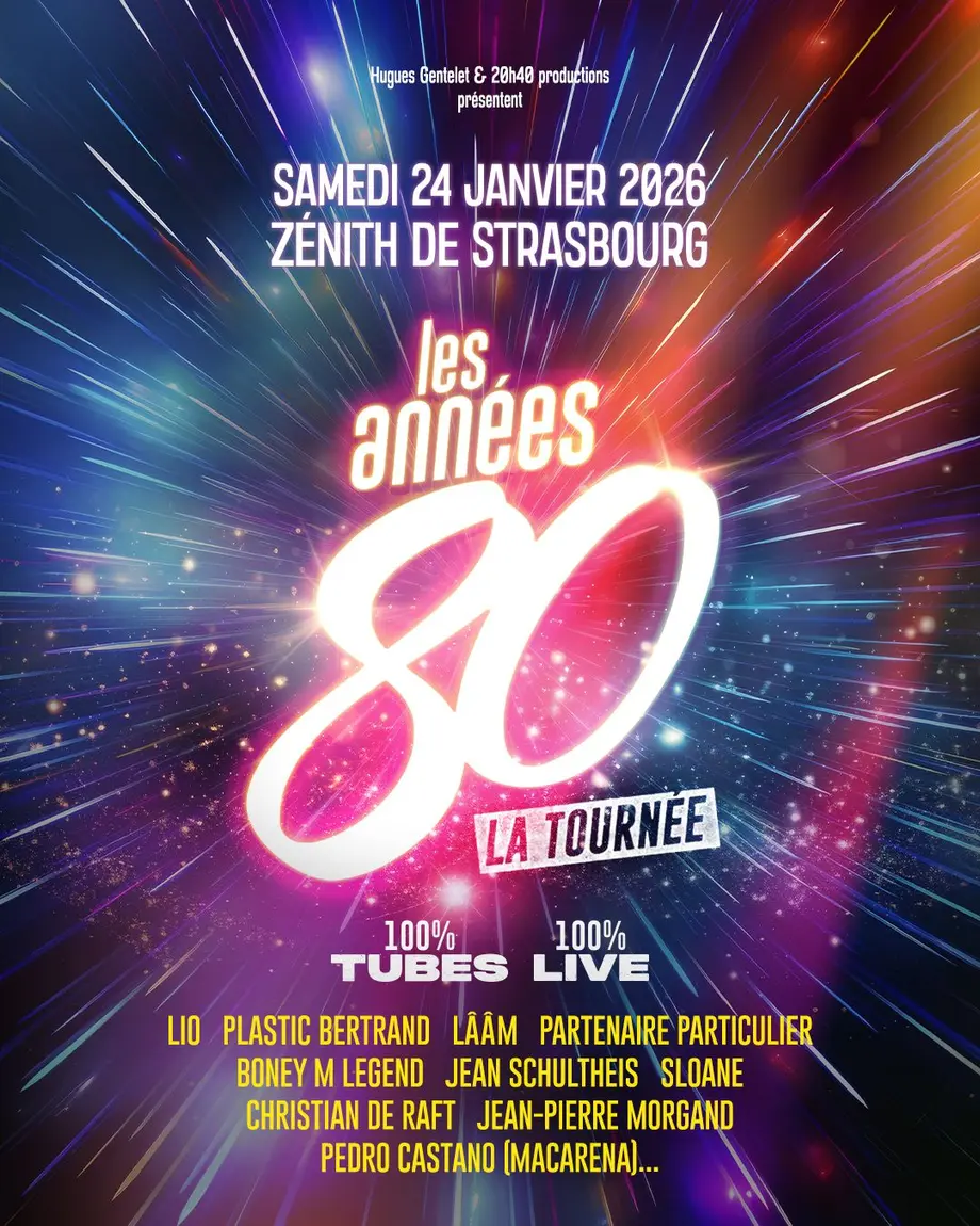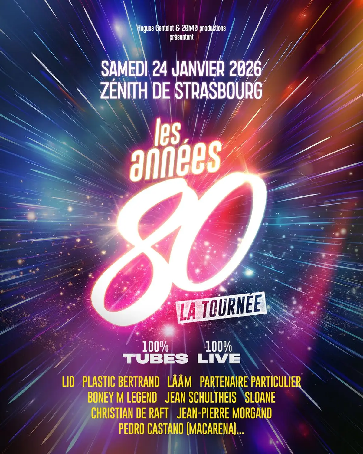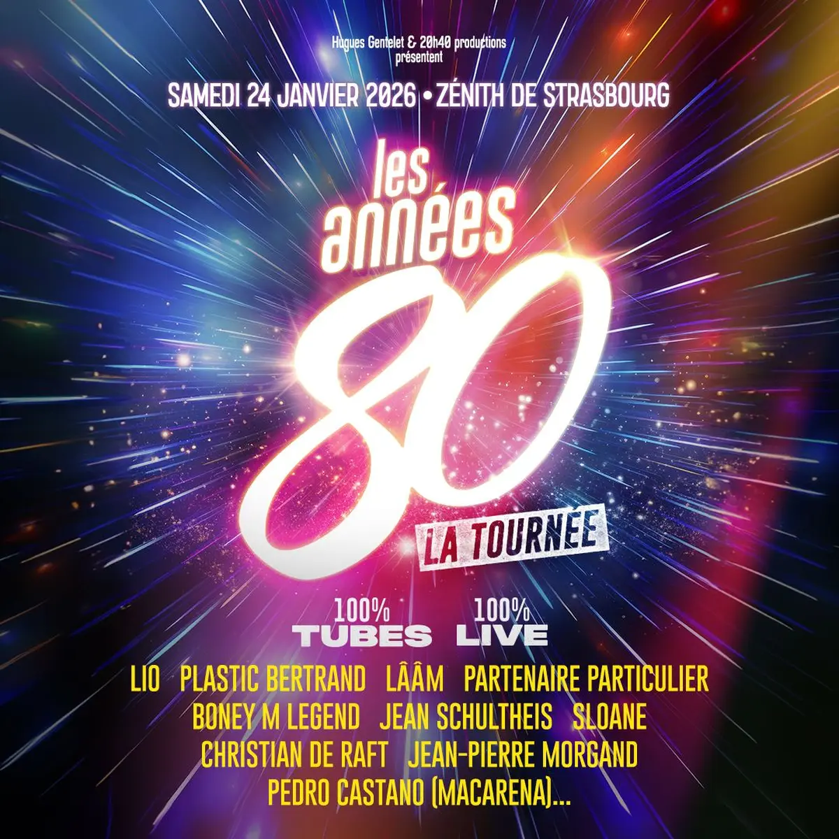 Les Années 80, la tournée c'est 3 heures de fête 100% Live avec les icônes de cette décennie : LIO, PLASTIC BERTRAND, PARTENAIRE PARTICULIER, SCHULTHEIS, SLOANE, CHRISTIAN DE RAFT, JEAN-PIERRE MORGAND, PEDRO CASTANO (MACARENA) ... Ils sont réunis sur scène pour vous faire (re)vivre en live leurs plus grands tubes de vos années cultes. Assistez à un show mémorable & exceptionnel où tout a été pensé pour une soirée d'anthologie !