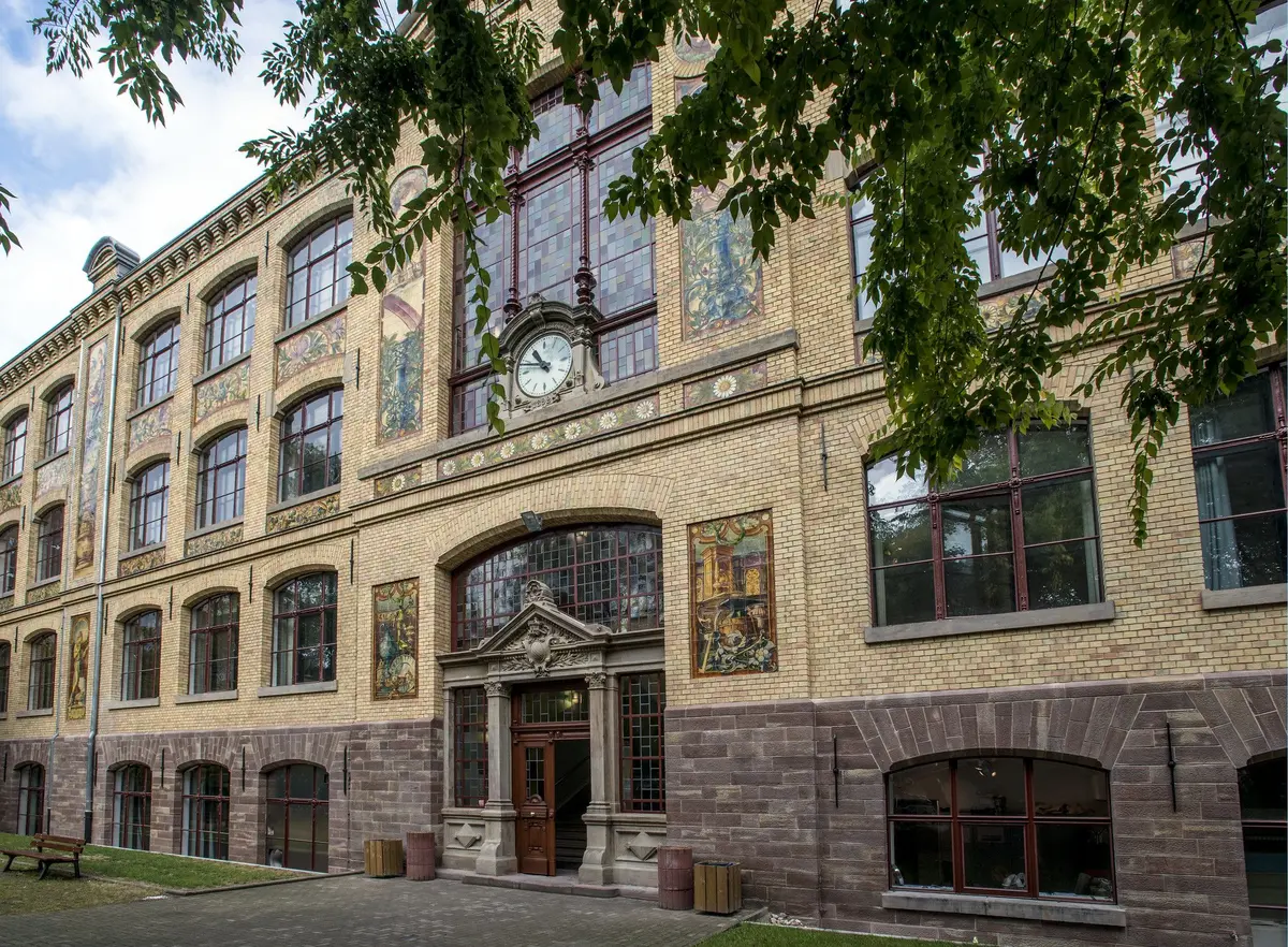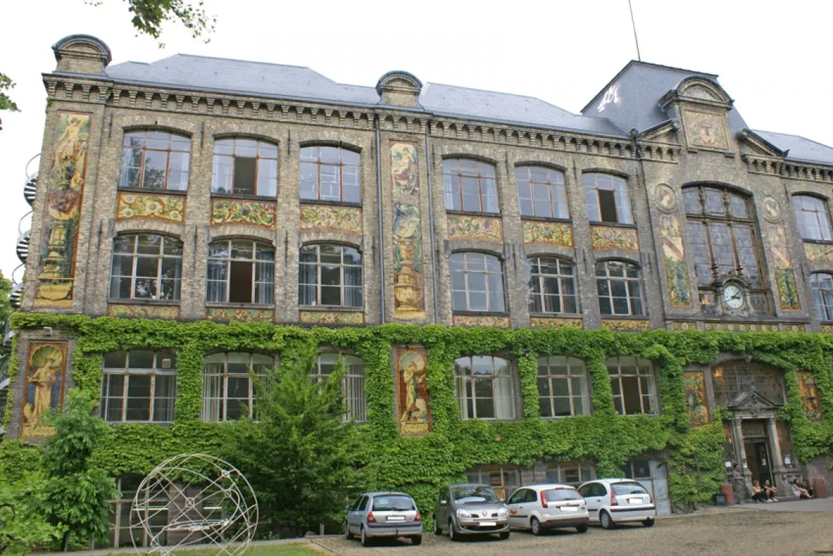 Recouverte de briques jaunes et de céramiques émaillées, la façade du bâtiment principal est classée monument historique depuis 1981