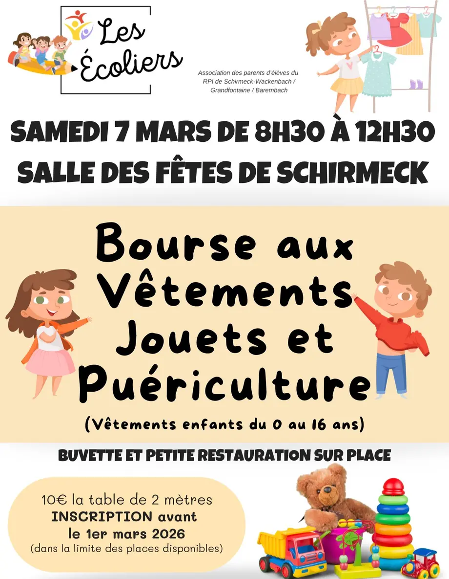 L'association « Les Écoliers » organise sa bourse aux vêtements et jouets le samedi 7 mars 2026.
