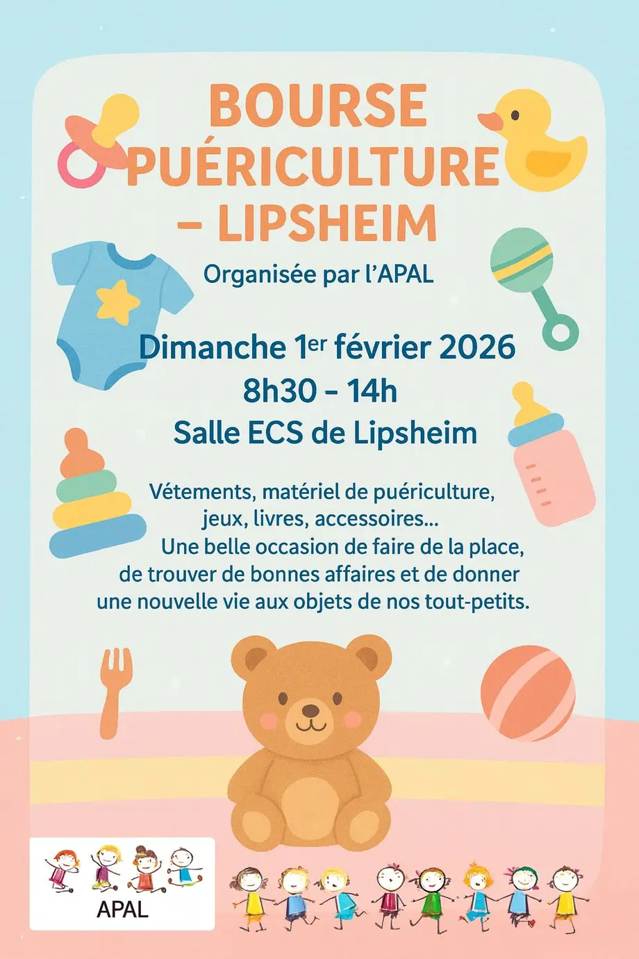 L’APAL, association des parents à Lipsheim organise sa grande bourse puériculture, jouets, jeux et vêtements pour enfants le dimanche 1er février 2026, de 8h30 à 14h00, dans la salle ECS de Lipsheim rue de la Croix.