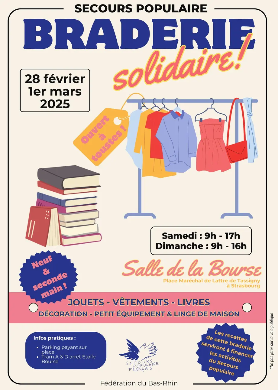 Les 28 février et 1er mars, le Secours populaire organise une braderie solidaire. Cette vente exceptionnelle vous propose des vêtements (femmes, hommes et enfants), des livres, des jouets, de la décoration, du linge de maison... Et d'autres surprises !