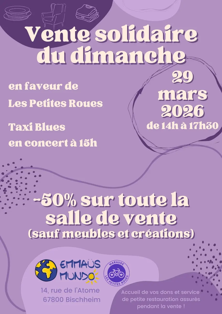 Nos Ventes Solidaires du Dimanche se poursuivent, encore et toujours... Les bénévoles d'Emmaüs Mundo vous ouvrent à nouveaux les portes de la Recyclerie Solidaire d'Emmaüs Mundo, située 14 rue de l'Atome à Bischheim, le dimanche 29 mars 2026 de 14 h à 17 h 30 pour cette seconde vente de l'année 2025.