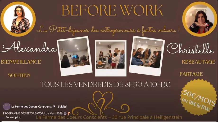 Rejoignez les Before-work de la Ferme Coeurs Conscients, un événement conçu pour vous aider à passer de la théorie à la pratique. Plus qu'une simple session de réseautage, ces matins sont dédiés au développement concret de votre entreprise.