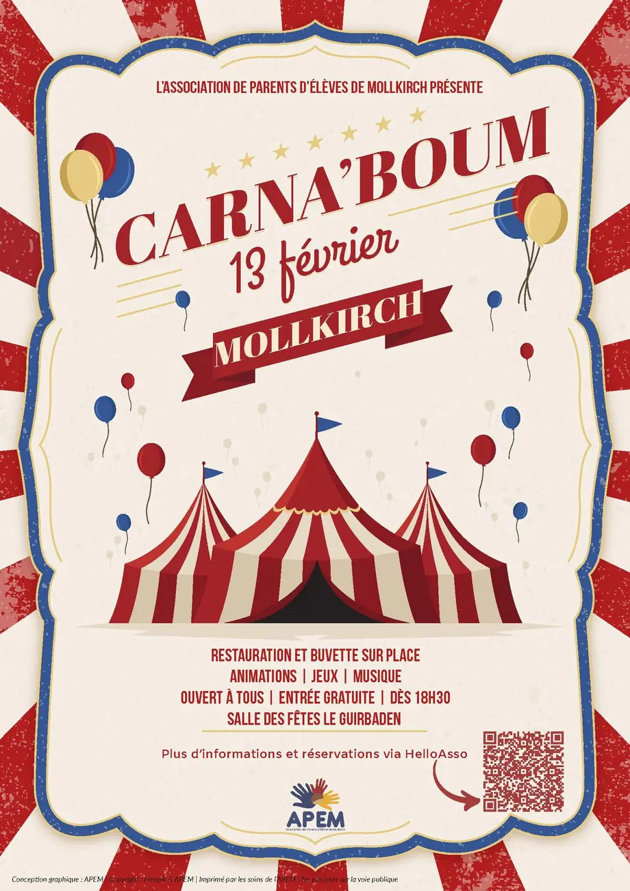 Le Carnaval de Mollkirch fait son retour sous un nouveau format intitulé la "Carna’Boum". Le vendredi 13 février 2026, à partir de 18h30, l'Association des Parents d’Élèves transforme la salle des fêtes du village en une fête foraine éphémère. Cet événement gratuit est ouvert à toutes les familles de la commune et des environs souhaitant partager un moment de convivialité.