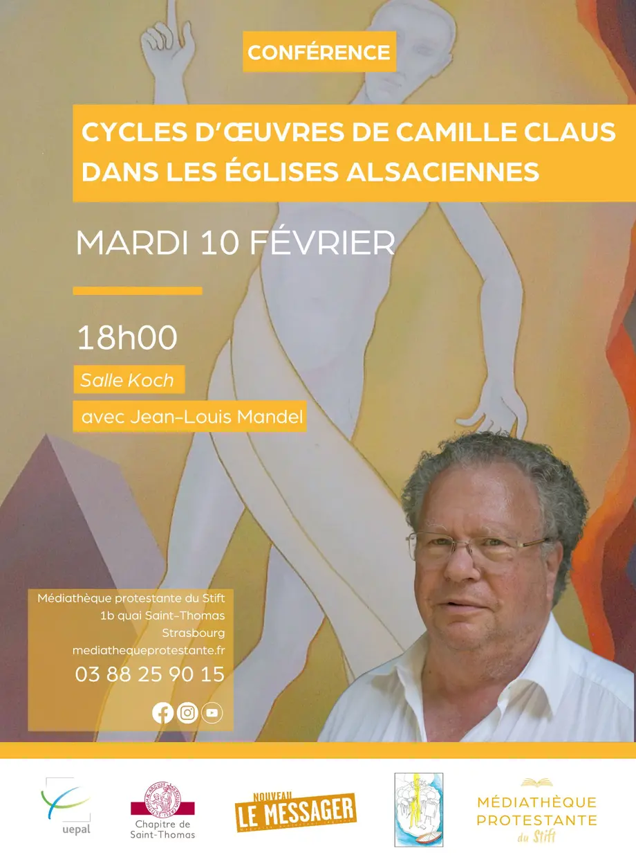 Dans le cadre de l'exposition "Icônes de la présence", la Médiathèque protestante du Stift programme une seconde conférence consacrée à Camille Claus. Animée par Jean-Louis Mandel, grand spécialiste de l’œuvre du peintre alsacien, elle portera plus spécifiquement sur les cycles de toiles peintes par Camille Claus pour des églises, tant protestantes que catholiques, dans le Bas-Rhin.