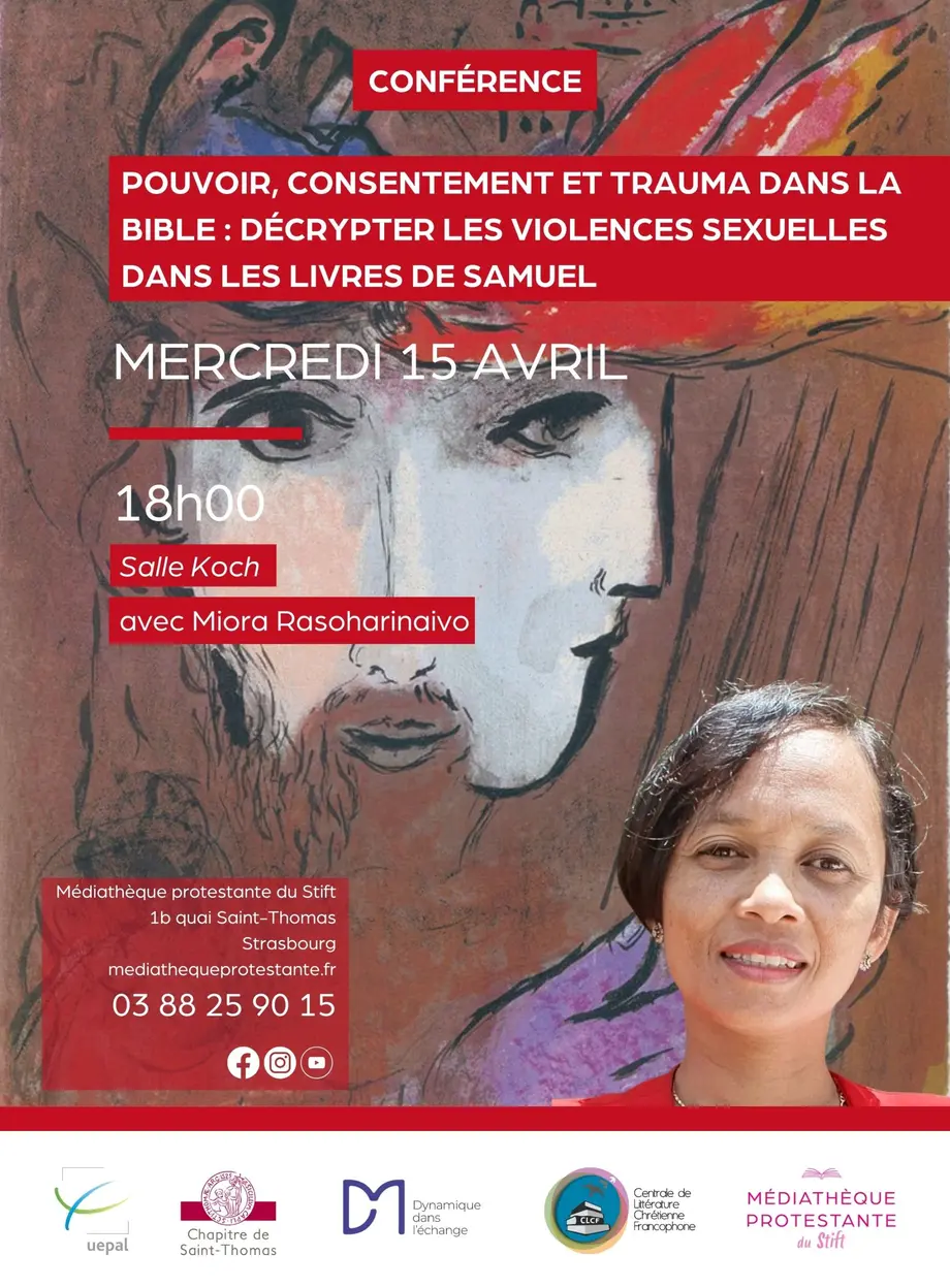 Pasteure et docteure en théologie, Miora Rasoharinaivo travaille en exégèse de l’Ancien Testament sur la question des violences sexuelles. Dans sa conférence, elle s’intéressera plus particulièrement à deux récits bibliques emblématiques : l’histoire de David et Bethsabée (II Samuel 11) et celle d’Amnon et Tamar (II Samuel 13).