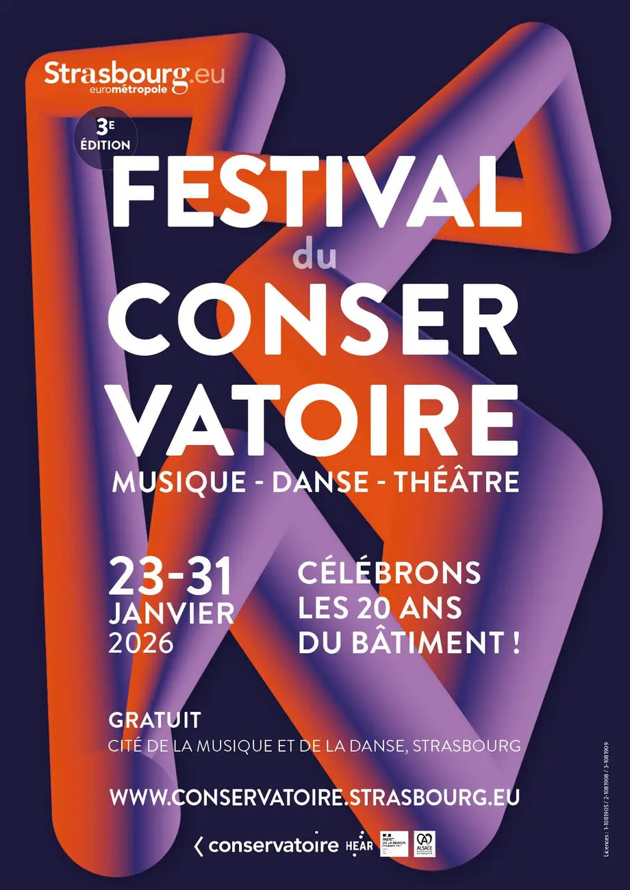 Le Conservatoire vous invite à la 3ᵉ édition de son festival, du 23 au 31 janvier 2026, un temps fort dédié à la musique, à la danse et au théâtre. Cette édition anniversaire célèbre les 20 ans du bâtiment et met en lumière la qualité des formations, ainsi que l’engagement et la créativité des élèves et des enseignants à travers 25 spectacles. Les dimensions artistique, scénique et pédagogique s’y articulent pleinement.