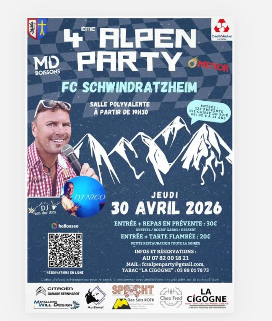 Le fc Schwindratzheim invité à sa 4ème ALPEN PARTY MIT ROSBiF, incontournable soirée festive et gourmande dans une ambiance digne des Schlagers allemands avec 2 DJ'S exceptionnels :