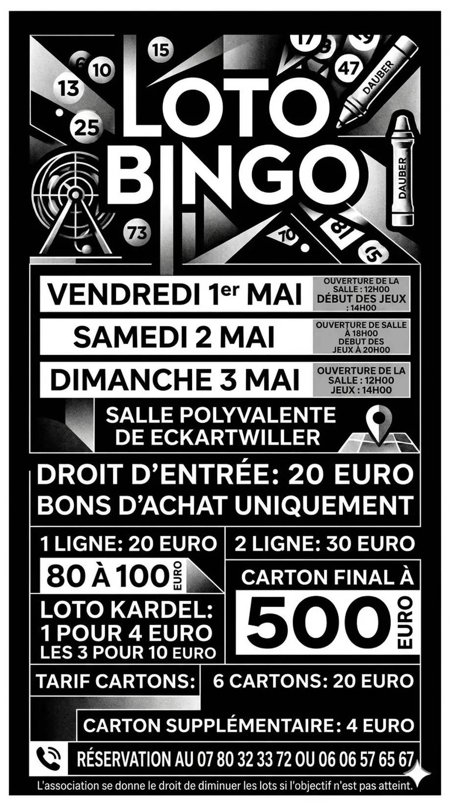 Super lotoLe 18/04/2026Blaesheimsuper loto organisé par le Lions Club Illkirch Doyen doté de nombreux lots de valeur dont 2 gros lots.