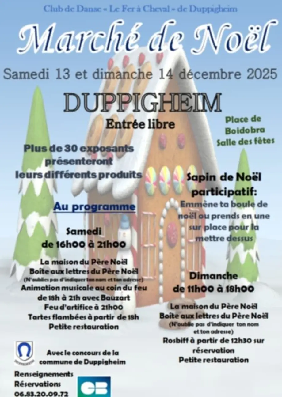 Le Club de Danse " Le Fer à Cheval " de Duppigheim organise son Marché de Noël les 13 et 14 décembre 2025. Artisans et commerçants vous proposent leurs différents produits et créations. Des animations sont au programme durant tout le week-end. Un sapin participatif sera sur place : emmène ta boule de noël ou prends en une sur place pour la mettre dessus. Buvette et petite restauration seront assurés par nos bénévoles. Tartes flambées le samedi soir à partir de 18h00 et rosbiff le dimanche à partir de 18h30 sur réservation au 06.83.20.09.72.