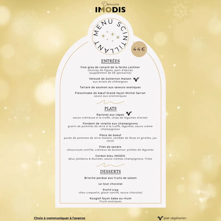 - Menu scintillant à 44 € : Entrée + Plat + Dessert