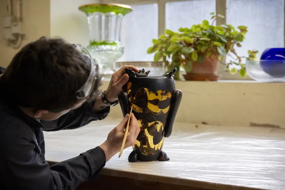 En 2025, sur l’invitation d’Emmanuelle Luciani, directrice artistique du cinquième cycle des Résidences d’artistes de la Fondation d’entreprise Hermès, Jacopo Pagin a été accueilli au sein de la cristallerie Saint‑Louis en Moselle pour y découvrir les savoir-faire verriers. Avec la complicité des artisan·es, les motifs oniriques qui habitent ses peintures se sont déployés à travers une série de vases en cristal intitulée Les ruines de la lumière.