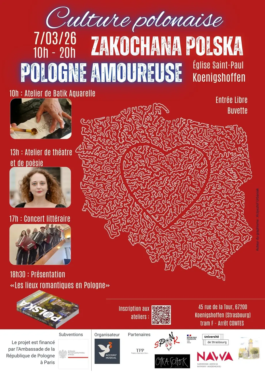 Le 7 mars, l’Église Saint-Paul de Koenigshoffen accueille une journée immersive dédiée à la culture polonaise, entre musique, poésie et voyage. Ouvert à tous, cet événement convivial propose ateliers créatifs, concert littéraire et présentation des lieux romantiques en Pologne.