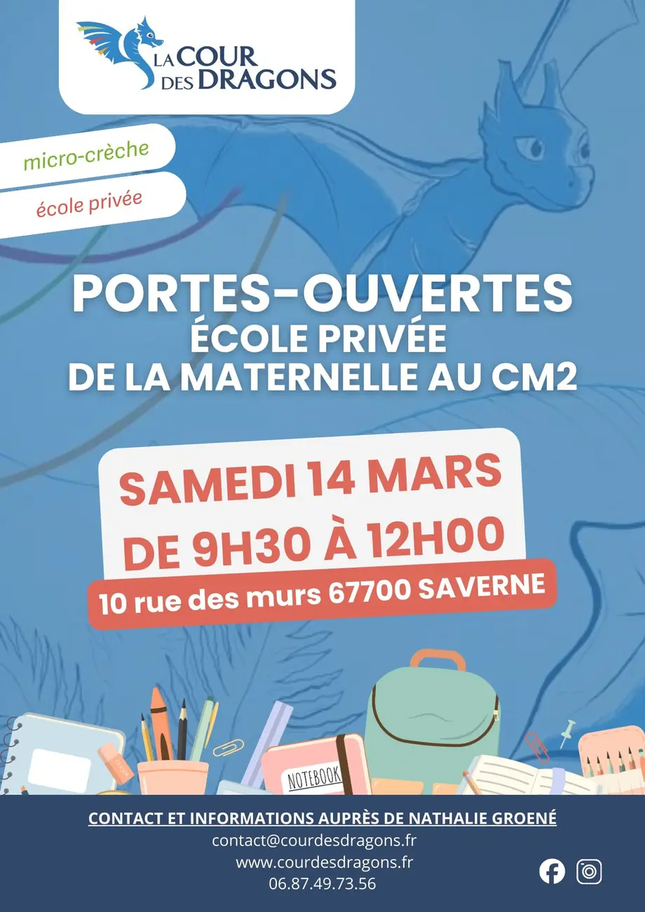 Parents de Saverne et des environs, l’équipe enseignante de La Cour des Dragons est heureuse de vous inviter à une réunion d’information, samedi 14 mars de 9h30 à 12h, pour tout savoir sur notre école privée et son approche pédagogique unique.