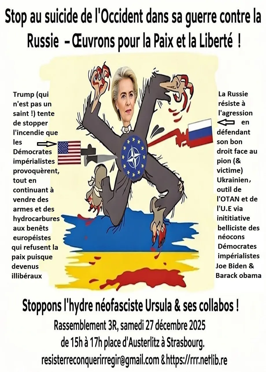 Rejoignez-nous le 27 décembre à Strasbourg pour crier : Non à la guerre, oui à la paix et à la souveraineté ! Apportez vos pancartes, votre voix et votre détermination. Ensemble, nous pouvons renverser cette tyrannie mondialiste et bâtir une France libre, prospère et en paix.