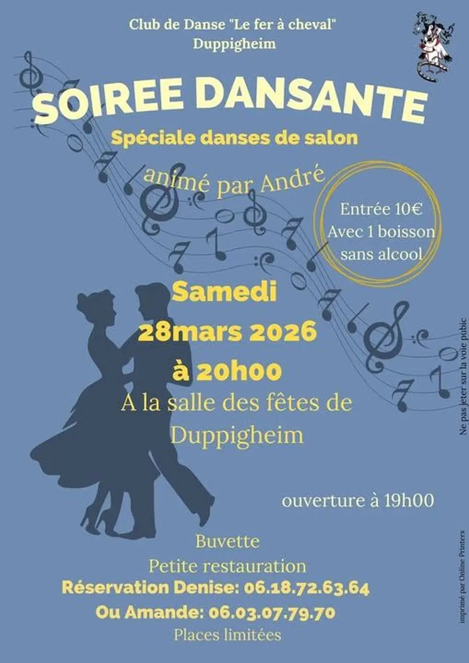 Le club de danse "Le Fer à Cheval" organise le 28 Mars 2026 à 20h une soirée dansante spéciale danses de salon dans la salle des fêtes de Duppigheim. Ouverture de la salle à 19h. Entrée 10€ avec une boisson sans alccol. Renseignements et réservations au 06.18.72.63.64 ou 06.03.07.79.70